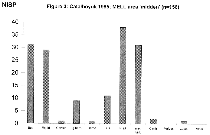 A comparison between building I on the north mound and the MELL area shows that the former produced a total of 547 animal bone fragments, while the latter yielded 2941 (table 1). When the volumes of deposit excavated are compared, the density of animal bone in building I is (preliminarily) 0.6 fragments/litre of soil; the 'fill' deposits in MELL area produced 1.9 fragments/litre, while the 'midden' has an average of 2.9 fragments/litre.