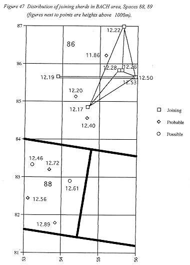 Figure 47 Distribution of joining sherds in BACH area, Spaces 88, 89 (figures next to points are heights above 1000m).