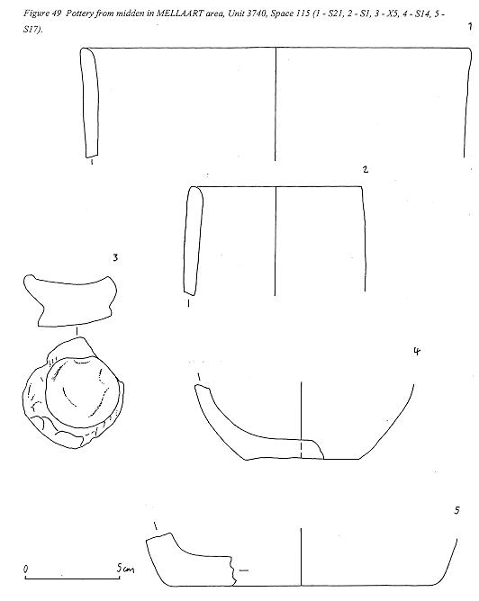 Figure 49 Pottery from midden in MELLAART area, Unit 3740, Space 115 (1 - S21, 2 - S1, 3 - X5, 4 - S14, 5 - S17).