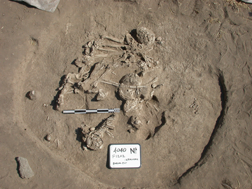 Neolithic period features identified on the site consisted of the wall lines of buildings and their associated internal and external features, such as hearths, floors, burials and middens. None of these deposits were excavated. Associated with these structures were single and multiple Neolithic burials, some of which were excavated in the 2003 season. Other burials were recorded and preserved in situ, with the intention of excavating them next season.