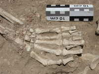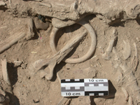 Unfortunately the number of individuals present was not initially apparent and excavation was conducted believing that one or two skeletons required excavation. However, as the upper remains within the grave were excavated more and more remains were revealed, most inter-tangled such that deeper located bones had to be released in order for upper ones to be lifted. Excavation was finally halted when a suitable horizon was reached. This complex of burials is therefore, still under excavation to be continued next season when it can be excavated within its surrounding context.