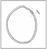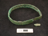 Neolithic date burials were only excavated where they were encountered eroding out of topsoil and underlying deposits, so there will be undoubtedly a greater number of Neolithic burials found during the next season. A combination of 38 single and multiple Neolithic burials have been excavated this season. One of the multiple burials (F.1202) was particularly interesting as it contained a number of grave goods including many shell beads of different size and shape, a stone, possibly alabaster, armband as well as a copper one. The presence of copper probably places the burial at the late Neolithic as hitherto copper has only ever been recovered from the Neolithic sequence in small fragments. This armband is by the far the largest copper object found which was beaten and folded (See Fig.15). Source is as yet uncertain as we await analysis results.