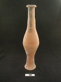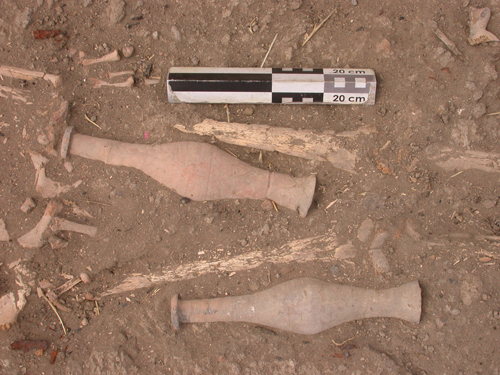 Approximately 22 Classical, Byzantine/Roman or Hellenistic period burials were excavated in the 4040 area this season. As with the Neolithic burials, the later period skeletons were only been excavated where they were disturbed during topsoil removal. Some of these late skeletons had grave goods, mostly consisting of complete ceramic vessels. Occasionally the burials contained more delicate items such as beads, and in one case a gold earring. In addition to the excavated skeletons, a number of late burial cuts have also been identified, drawn and annotated on the overall 4040 plan. These burials were not excavated in the 2003 season; which will be carried out in forthcoming seasons.