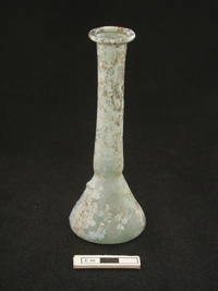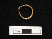 As poorly preserved as the skeleton was, as nicely preserved were the grave goods (Fig. 19). These included five so-called ‘melon beads’ next to the right ankle, and two long ceramic vessels found adjacent to the femurs. These vases may have originally been placed in her hands. The elongated, narrow shape of these vases is common among Roman / Byzantine burials on the mound. Between the tarsals was a complete, small glass vessel, probably used for perfume. Most remarkably, however, was the discovery of one gold earring resting under the cranium.