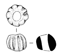 Burial F.1244 represents a multiple Neolithic burial apparently located in the northwest corner of a building which was visible after the removal of topsoil. The remains of numerous individuals were present in the fill although the most articulated was represented as skeleton (8813). The remains were in very poor condition and had been disturbed by late (classical) burials F.1242 and F.1402. The significance of burial F.1244, were the number of artefacts recovered from a concentrated area suggesting they were placed as a group between the head and knees of the crouched burial. These included two complete clay stamp seals of geometric design; one was closely associated with skeleton (8813) 8813.X1 and the second within the general fill (8814) 8814.X15 (see Stamp Seals below). Other material included an elongate marble(?) bead, two bear teeth, worked stone, a pre-form bone ring and bone ‘fork-type’ object (See Fig. 48). A further four beads were recovered from the flotation residue.