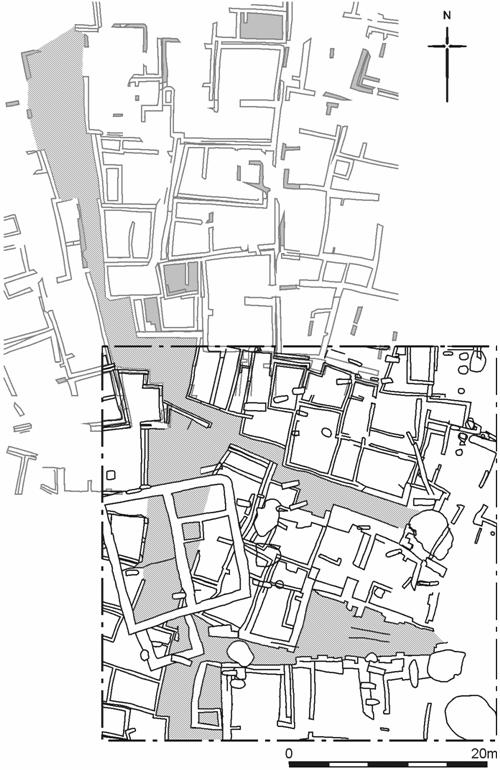 The overall site plan suggests that the buildings in 4040 are formed into distinct groups. These groups seem to have been defined by at least two linear open areas of varying widths, that have been referred to as possible ‘streets’ or alley ways, running east–west across the site. The first ‘street’ was visible in the northern extent of the site and was traced from grid square 1030E/1170N down to grid square 1060E/1155N (see Fig. 4), at which point it ended, changed its course, or simply became indistinct. This first ‘street’ was initially identified during the 1993 season, where it was mapped running approximately north–south across the area. The second ‘street’ became visible in grid square 1035E/1135N where it ran northwards and then turned to the east in grid square 1040E/1140N becoming indistinct in grid square 1060E/1140N. The widths of both ‘streets’ were extremely variable throughout their courses, for instance the second street appeared to measure up to 6m across in grid square 1050E/1145N, and only 0.3m across to the west in grid square 1045/1140.