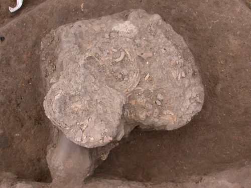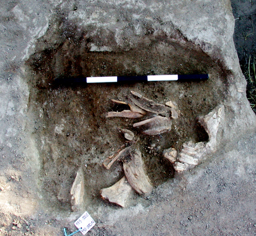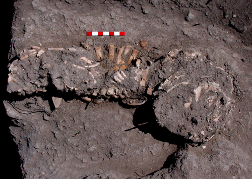 A burial of an infant, aged less than three months (F.1166), was placed in unit (7864). The skeleton (7878) was largely destroyed, in particular its postcranial part (Fig. 28). Thus the exact position of the body cannot be recognized. It appears that the child was buried in a crouched position on the left side with face looking outwards. The body was probably placed in a basket. The burial cut was difficult to observe. Interestingly, a large fragment of cattle pelvis (7888) was found under the child‘s head, which may be a special deposit with symbolic meaning. However, it is not clear whether this was an intentional or a coincidental placement. It is striking that this burial was situated ca. 17 cm directly underneath F.997, which is a hearth with the feasting deposit (7477), located in SE corner of Building 33 (see above). Large pieces of cattle (maxilla, scapula, humerus, radius, femur) bones were found there.