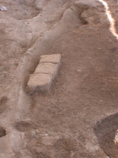 A few other burials were found but they have not been excavated yet. In these groups there were two sophisticated structures, identical to those recovered in the 2001 season. This construction consisted of a large pit usually oval in shape and not very deep. A massive wall was built at the base of this pit. Its length corresponds exactly to the length of the pit itself. Once the pit was dug out and wall constructed, a proper burial pit was dug, always from the southern side of the wall. A row of diagonally placed mudbricks formed its marker.