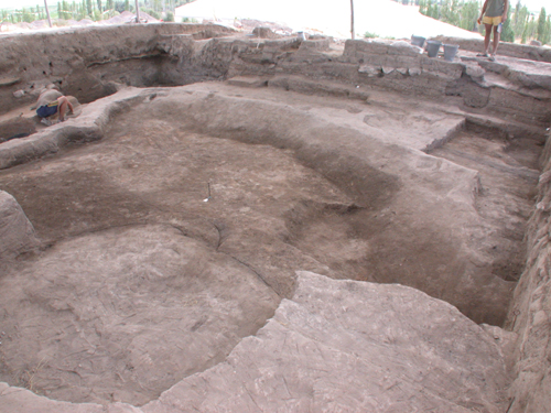 Fragments of floor have been identified in the central part of the Building (7608). It was a relatively compact grey silty layer with mid brown inclusions. At the base there were numerous macrobotanical remains. The layer also contained a large number of artifacts. Its upper part is at the same level as the base of mudbricks of eastern and western walls. A number of layer of different consistency, colour, texture, and bedding was deposited directly underneath the floor of the building (units (7603), (7604), (7607), (7609), (7610), and (7613). They are probably associated with the phase before the house was inhabited. Individual brown mudbricks ca.: 0.3 x 0.35m large, were found in the southern part of unit (7603) (also unit (7606). Some layers (e.g. (7604), (7609), (7613) are certainly upper part of midden deposits on which Building 34 was built. Size and shape of some of them differed evidently from the layout of the building and they were partly located outside its borders, which indicates clearly that they belong to earlier phases of depositional history of this part of the mound (in particular units (7609) and (7613).