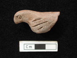 A number of large red painted plaster were found in the bricky infill. Another interesting find comprises an anthropomorphic figurine (Fig. 29) and clay pot stand (Fig. 30). In addition to these structures, numerous Neolithic artifacts were found including pottery, obsidian tools, grinding stones, beads, and bone tools. The abundance of Neolithic pottery demonstrates a wide range of forms and decorations. Another interesting find was a Roman zoomorphic figurine (Fig. 31).