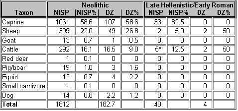 Here we report briefly on the animal bone remains excavated in the TP area during the 2002-2003 seasons. These include both Neolithic and Hellenistic/early Roman assemblages. Of the total of 13,209 pieces recorded from this area during these seasons (a total of 15,257 have been recorded including the 2001 season), the majority derive from Neolithic levels (11,814). It was possible to identify to species only 1812 of these mammal remains (Table 2), as a result of high fragmentation of most of the material. Bone fragments from the Neolithic material average 2.5 cm in length, and circa 2.3 cm in the late Hellenistic/early Roman material.