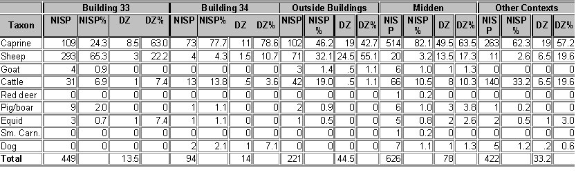 The proportions of taxa are generally similar to those in Building 33 (Table 3). The faunal material from most of these units ((7390), (7430), (7603), (7604)) looks like redeposited material from mixed origins as is typical of fill units. Unit (7613) seems less redeposited and suggests a small amount of midden material.