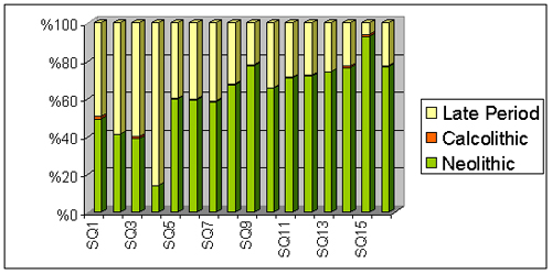 According to this analysis, Neolithic sherds increase towards south of the scraped area and also the proportion of the Neolithic sherds are quite high in squares 9, 11, 12, 13, 14, 15 (highest-1050E-1135N) and 16, where the disturbance of later period occupation is less over this part of the mound (Last also mentioned a high percentage of Neolithic sherds in the northern eminence in general, but also he points out that square 1045/1125 indicated an increase in Neolithic pottery). Despite the large late period construction, Building 41, to the west of the area (1030/1155; 1040/1145, 1155) there are relatively more Neolithic sherds than late material, this is probably because the sherds derive from the Neolithic midden deposits through which the late structure is cut. The northern part of the area (1030-1070E/1165-1175N), especially square 4, contained the highest score for late material and may indicate unidentified pits of late dates not visible because of the loose surface soil. The NE sector of the area where there are small spaces and mostly walls have more or less the same proportion for the late and Neolithic sherds. Chalcolithic sherds which are recognised by paint decoration, were quite rare and did not show any meaningful distribution.