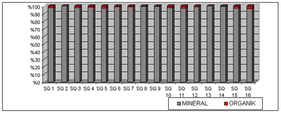 When we evaluate our data according to the summary given above, we see that in the 4040 Area the organic temper percentage is quite low while the mineral inclusion is dominant in all squares (Fig.53) and the mineral tempered sherds percentage in all Neolithic sherds are never lower than 96 %. The mineral tempered sherds are generally well made, fine wares; there are rarely coarse grits but quite often, sand, mica or quartz, calcite or shell pieces used as inclusion or these inclusions were already in the clay naturally.