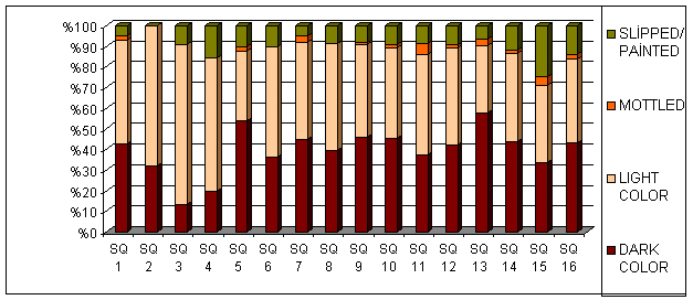 The external surface colours were determined visually not by Munsell charts. The colours and indicative surface treatments are arranged in four groups: Dark (dark grey, dark brown and rarely black), light (heavy to light buff, cream, yellowish cream), mottled (red/dark grey, orange/buff or cream), slipped/painted (cream, red or dark brown slipped and paint decorated ones). All the paint decorated body sherds have been taken as diagnostic.