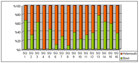 Holemouth and bowls are the two main ware forms for the Çatalhöyük Neolithic period (These categories were used by Last with this explanation: “...ditinguishing ‘bowls’(open) and ‘holemouths’ (closed) should not be taken as an indication that vessel forms fall into just two categories; rather it reflects an attempt to use the information from rim sherds to distinguish broad vessel families...” (Last 1996:116), and we will use the same categories to evaluate the existing pottery types for a general view and for comparison with the previous studies. The dominant presence of these forms is identical for the levels as we mentioned above. Thus we looked to the distribution of the holemouths and bowls to be able to compare their proportions in all the diagnostic sherds (Fig.55 and Table 10).