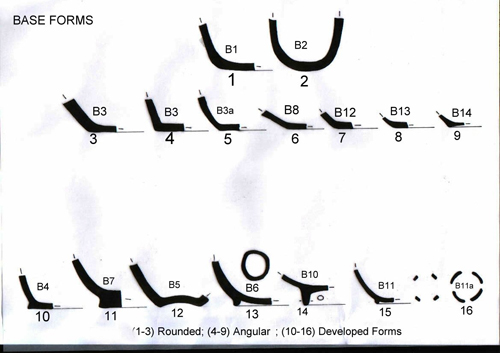 Mellaart and Last recorded that rounded bases are an earlier element but on a decrease until Level I (Fig. 56:1-3). The angular junction-type belongs to later periods (Fig. 56:4-9) starting from Level VI (Mellaart 1962: Fig.9:15-Level V and Last 1996:117) and the “developed” bases (Fig. 56:10-16) are not found before Level VI and mostly seen in Level V and quite common in Level III (Last 1996:117).