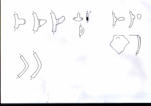 According to the perforations, it is clear that the dominant type are single perforated horizontal lugs which evidently points to Level VI-IV. A double perforation is almost non existing except square 8 with a low proportion. This indicates that the rest of the area can not be earlier than Level VII. The other important indicator is the lug shape as there are 3 main shapes: pointed (Fig. 57:2), straight (Fig. 57:1) and flaring (Fig. 57:3).The flaring lugs are dominant in square 6, 8, 10, 13, 14 and 15 while the straight lugs are dominant only in square 9 and the pointed lugs are dominant in squares 4,5,7. But unfortunately this distribution does not indicate a pattern. But more flaring lugs than straight ones may indicate Level VI and later. Knobs (Fig. 57:6) are not common but there is a variation of crescent (Fig 57:8), horizontal, vertical or round ones. But an animal headed one (Fig. 57.7) which is also quite rare, can be indicative of Level V (Last 96:116). The basket handles have 2 variations: one of them is incised on the external surface (Fig.57.4), on both sides of basket handle junction to rim and the other has a straight lug on the junction of the handle to the rim. There is one sample in Mellaarts backfill (Last 1995: Fig.2:1). Basket handles generally occur between Levels VI-V.