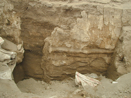 By the end of the 2003 it was evident that the section above the main north-facing wall was crumbling at quite a rapid rate. In the past an attempt has been made to consolidate this section with a 5% or 10% Primal solution, to prevent this occurring. The result may be that this has increased the stresses and load within the soil section causing the face of the section to fall more quickly than it otherwise would. At the end of season, the section was covered with geotextile and small sand bags were made up to stack up against the section to prohibit further erosion. Structural instability of this section was evident, with fear that the archaeology yet to be excavated would collapse over the winter months.