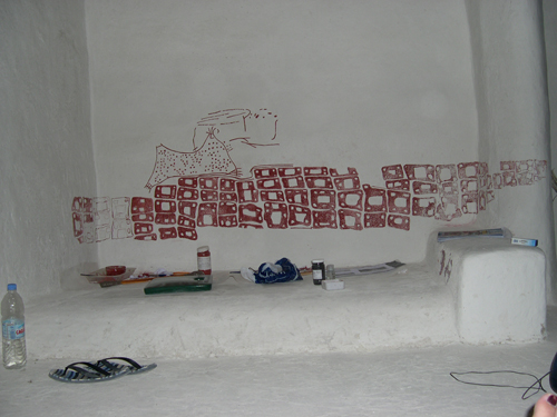 The same image was used in the experimental house during continued experimentation of pigment and binder use in Neolithic wall paintings recorded on site (fig. 65). During the 2002 season, casein (milk protein) was used to bind red iron oxide pigment. This used to paint a “bird and headless people” scene onto dry plaster walls. It was evident however during the 2003 season that the pigment and binder had delaminated from the plaster due to paint shrinkage and lack of bonding with the dry plaster. A mixture of iron oxide and water was made up and used by Ina St George during the 2003 season; utilising the hygroscopic nature of the plaster, thereby creating an intrinsic bond between paint and plaster. The result of this will be recorded in the 2004 season.