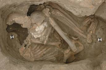 | Figure 3: Skeleton (11306) holding plastered skull (11330) from Building 42 |