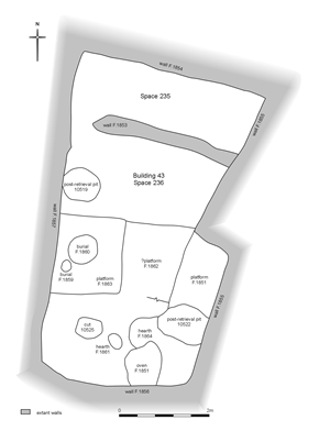 Excavations in Building 43 began on the 29th of July 2004 and was completed on the 5th of September 2004. After emptying backfill, we found the interior wall which divides the building into two rooms. Space 235 is a small room to the north and Space 236 larger to the south.