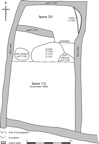 For reasons outlined earlier, the two post-retrieval pits and burial F.1702 could not be related to either of the two floor sequences in Space 112. In the southern part of the room excavated in 1997 the posts were removed in between the two occupation phase (112.3), but there is mention of a possibility that the posts were removed twice.