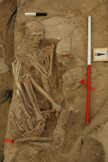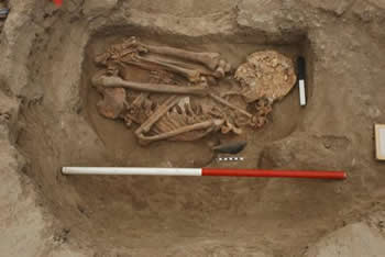 At a later stage a series of other burials were placed in the south central part of Space 112, cutting through the southern part of F.1702. The northern part of F.1702 was unaffected, which is clearly demonstrated by the front legs of sheep.(10828/10839) that were in situ.