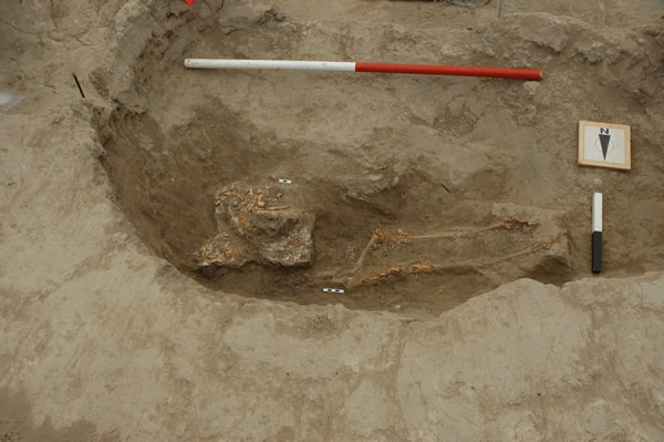 Burial F.1709, cut (10830), fill (10831), skeleton (10813), heavily disturbed earlier burial F.1711(Fig.59). When the area was opened up,cut.(10830) most of the long bones of (10814) were removed and placed on the side of the new burial cut. Given that these elements are still partially articulated it seems that the body of (10814) had not yet entirely decomposed, which indicates that the interval between the two burials may not have been a long one. The skull of (10814) was also removed (jaw and upper incisors remained in place), but was not placed in this burial F.1709. It was found elsewhere and will be discussed later.