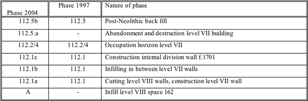 In the 1997 season the southern 2/3 of Space 112 was excavated by the current project. A preliminary report is available in the 1997 Archive Report (Farid 1997), and a final publication will soon appear in print (Farid in press). The reader is referred to these sources for extensive treatment, but for the present purposes a short summary of the post excavation sequence of Space 112 will be given. In total five stratigraphical phase were distinguished in this area. In 112.1, the first phase, the outer walls were constructed (west F.267, south F.286, east F.259). Further a packing was deposited between the walls (units 2776/2735/2716/2305) and some activity related deposits were found (units 2096/2079/2086). 112.2, the next phase, represents an occupation horizon, with floors, a platform (F.86), burials (F.83, F.84, F.89, F.251, F.258, F.274, F.277, (2017), totalling 11 individuals), and a hearth (F.96) in the southwest of the room. Phase 112.3 represent a renovation of the space, during which a support wall was placed in front of the southern part of the east wall (F.253) and in front of the south wall (F.85). Also during this phase the two southern posts were removed (post retrieval pit F.275 in the west and post retrieval pit F.276 in the east), but it is possible that the posts were reinserted after the support walls had been constructed (Farid in press). Subsequent phase 112.4 represents another occupation phase with a number of flaky floors and occupation lenses (units 2035/ 2046/1882/2802/2781), dipping down along the east and west walls. Finally, phase 112.5 represents the post Neolithic back fill deposits of the 1960s excavations.