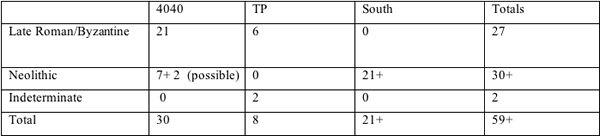Table 11: Late Roman/Byzantine and Neolithic individuals found in each of the main excavation areas in the 2004 field season (=MNI)