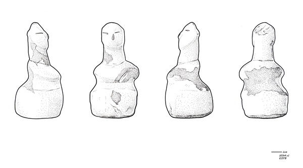 The question of sexual ambiguity or synthesis should also now be considered key. The stone figurine found this season is a prime example (10264.X1, Fig. 4), since the head and neck suggest a phallic shape on a cylindrical base. Interestingly it shares visual similarities with Neolithic SE European masked figures as well as Cypriot figurines.