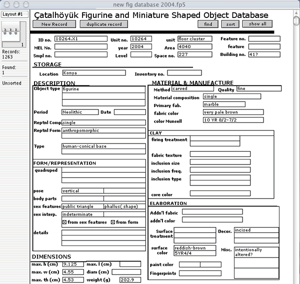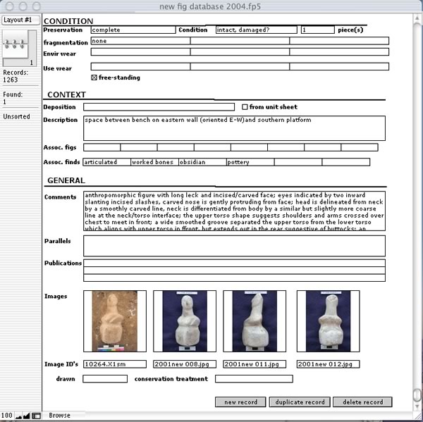 At the outset of our first season, we also found ourselves engaged in a test-run of sorts; the project's ambitious goal for a web-accessible integrated database by the end of 2004 compelled us to conceive and design a new figurine database that Mia could centralize with the main Access system. Our part included creating a sophisticated and integrative standalone figurine database in Filemaker Pro 7. But given the time constraint (two weeks), the database could not be successfully interfaced with the main Access excavation database as a fully functional research tool. By the end of this initial period, however, Mia had developed an Access interface for the figurine database that allowed one to view, but not enter data. This result was largely due to time constraints and lack of familiarity with the Çatalhöyük materials. When we have fully examined the figurine corpus, we will be in a better position to consider potential areas for cross-categorization across other data sets and think through a design that can adequately address these issues. We must therefore emphasize the present state of the figurine database as a promising work-in-progress and we will continue to collaborate with Mia and other specialists towards implementing a well-integrated figure database.