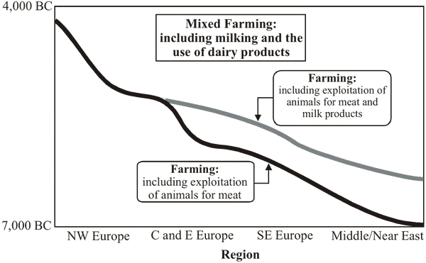 The domestication of the principal livestock species (goat, sheep and cattle) took place in the Near (Middle) East in the 8th millennium BC, in the area known as the "Fertile Crescent". By the 4th millennium BC there is evidence for the specialised exploitation of these animals for milk, wool and traction purposes by the first urban communities in Mesopotamia (Sherratt, 1981) , principally indicated by textual and pictorial evidence. The initial (Neolithic) mode of exploitation in this area, as shown by culling patterns reconstructed from bones recovered in excavations, suggests an emphasis on young animals for meat, and this simple type of livestock use is typical of the earliest farming groups in Europe (Bogucki, 1984, Benecke, 1994). However, there is considerable uncertainty about the date at which milking was first practised, and this is particularly interesting in view of the widespread occurrence of adult lactase deficiency in human populations. By the time that farming reached the British Isles in the 4th millennium BC, herd structures with a high proportion of mature females indicate that cattle were probably being exploited for dairy products (Legge, 1981) . This supports a reconstruction of the beginnings of dairying as shown below (Fig. 105).