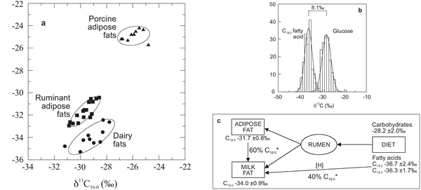 Figure 106. (a) Plot of the d 13 C values of the major saturated fatty acid components (C 16:0 and C 18:0 ) of the lipid extracts from modern reference fats showing the resolution of dairy fats from ruminant and non-ruminant adipose fats. The three fields correspond to 1 s.d. confidence ellipses calculated for the d 13 C values of the domesticates known to comprise the major component of prehistoric economies in Britain. All the animals were raised on C 3 diets. The d 13 C values for the fatty acids have been corrected for post-Industrial Revolution effects of fossil fuel burning, which has led to more depleted atmospheric d 13 CO 2 values, and has been calculated to be 1.2‰ (Friedli et al., 1986) . Analytical precision is ±0.3‰. (b) Histogram of the d 13 C values of C 18:3 fatty acids and glucose extracted from plants. The histogram of the d 13 C values of the major fatty acids and carbohydrates of 166 modern plants demonstrates that there is an 8.1‰ mean difference in the d 13 C values of C 18:3 fatty acid (mean = -36.3‰) and glucose (mean = -28.2‰) which is the basis of the difference in the d 13 C value of the C 18:0 fatty acid in dairy and milk fat. This difference in d 13 C value between lipids and carbohydrates is seen in both C 3 and C 4 plants. (c) Diagram showing the routing of dietary fatty acids and carbohydrates in the rumen, adipose tissue and mammary gland of the ruminant animal. 60% of the C 18:0 in ruminant milk is rerouted from adipose tissue and is comprised of carbon originating from dietary glucose and fatty acids, and the remaining 40% (McDonald et al., 1988) is directly incorporated from the diet following biohydrogenation of unsaturated fatty acids in the rumen (* in diagram), and reflects the inability of the mammary gland to biosynthesise C 18:0 (Christie, 1981, Byers and Schelling, 1988) . The 2.3‰ mean difference in the d 13 C values of C 18:0 in ruminant adipose tissues and dairy fats can be seen graphically in Fig. 106a.