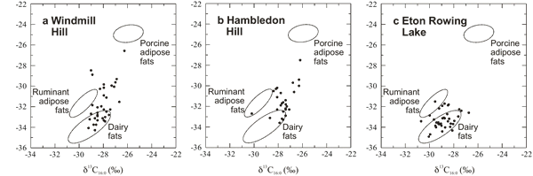 Figure 107:. Plot of the d 13 C values of the major fatty acid components (C 16:0 and C 18:0 ) of lipid extracts from potsherds from the Neolithic sites of (a) Windmill Hill, (b) Hambledon Hill and (c) Eton Rowing Lake. The fields corresponding to the modern reference fats (c.f. Fig. 104 a) serve to classify the lipid extracts. Sherds that plot between the ruminant and non-ruminant adipose fat ellipses provide evidence for the mixing of these fats in the vessels. Analytical precision is ±0.3‰.