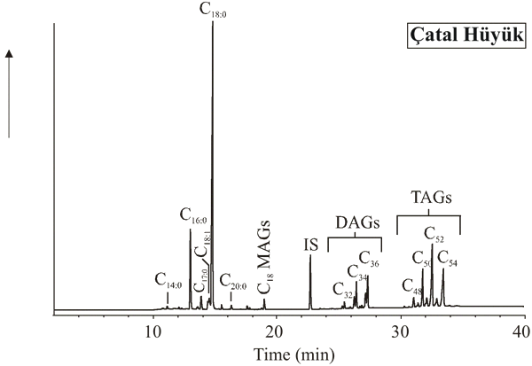 In order to assess the level of preservation of lipids in very early pottery vessels from the Near East, pilot studies that have been completed, utilising sherds from Çatalhöyük, Turkey and from Tell Bouqras and Tell Sabi Abyad, Syria. Results obtained from sherds from these sites have shown that degraded animal fats are preserved in pottery vessels dated to the 6 th Millennium BC. Out of the 40 sherds from these three sites, 10 (25%) have yielded significant concentrations (>50 m g g -1 ) of lipid. Fig.108 shows two typical gas chromatograms obtained during these pilot studies. These three sites are over 2000 years older than the early Neolithic pottery we have analysed from Britain. This is probably oldest pottery in which lipid residues have been reliably detected and given the great age of the vessels the level of preservation is remarkable. These data confirm that results will be obtained from other pottery throughout the regions targeted in this proposal.