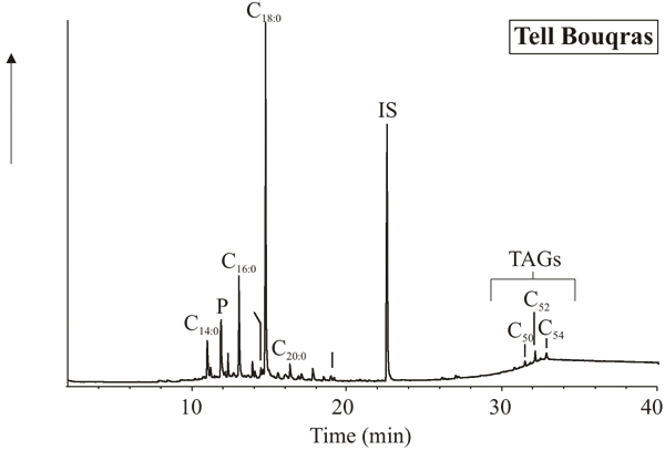 Figure 108. Partial high temperature gas chromatogram of the total lipid extract from a sherd from Çatalhöyük, Turkey (top) and Tell Bouqras, Syria (bottom). C X:Y refer to fatty acids of carbon chain length x and level of unsaturation y. C x MAGs are monoacylglycerols of acyl carbon number x; C x DAGs are diacylglycerols of acyl carbon number x; C x TAGs are triacylglycerols all of carbon chain length x. IS is the internal standard (n-tetratriacontane). P is a plasticiser originating from the plastic bag that the sherd was kept in during storage. A DB1 (immobilised dimethyl polysiloxane) fused silica capillary column (15 m x 0.32 mm, 0.1 m m film thickness) was used. The chromatograms are dominated by saturated fatty acids, which is in keeping with organic residue analysis of archaeological pottery from other geographical regions that we have studied. However, varying abundances of TAGs, DAGs and MAGs are present, thus indicating the remarkable level of preservation that exists at these sites, even after 8000 years of burial.