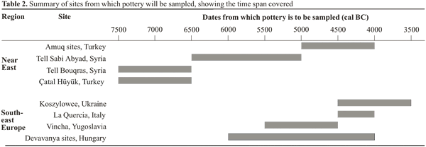 The applicants already have access to the appropriate excavated pottery samples from known contexts, the majority of which are already in the UK, and extensive use will be made of relevant material in British museums (for instance very large pottery assemblages are available in Oxford from 6th millennium sites in Hungary and 5th millennium sites in Bulgaria and Romania). Opportunities also exist for pottery to be sampled from new excavations during the course of the project. Table 2/57 indicates the chronological range of sites from which samples are already available, either supplied by the excavators or available in UK museum collections for which sampling permission has already been given. If preservation levels in the selected assemblages fall below the expected ranges (which highly unlikely), it will be possible to supplement them with samples from deposits in the circum-Alpine region, from museums in Zurich, Ljubljana and elsewhere.