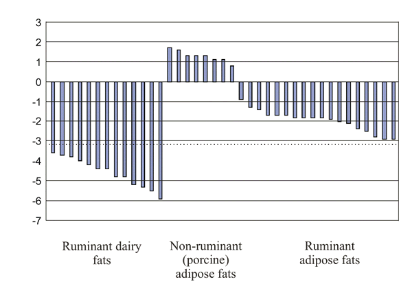 Figure 109: The d 13 C 18:0 - d 13 C 16:0 (= D 13 C) values for the reference animal fats. The D 13 C values for the ruminant dairy fats are more depleted than the ruminant adipose fats; the difference in the mean values is c. 2.8‰ which is highly significant (T-test; p<0.0005).